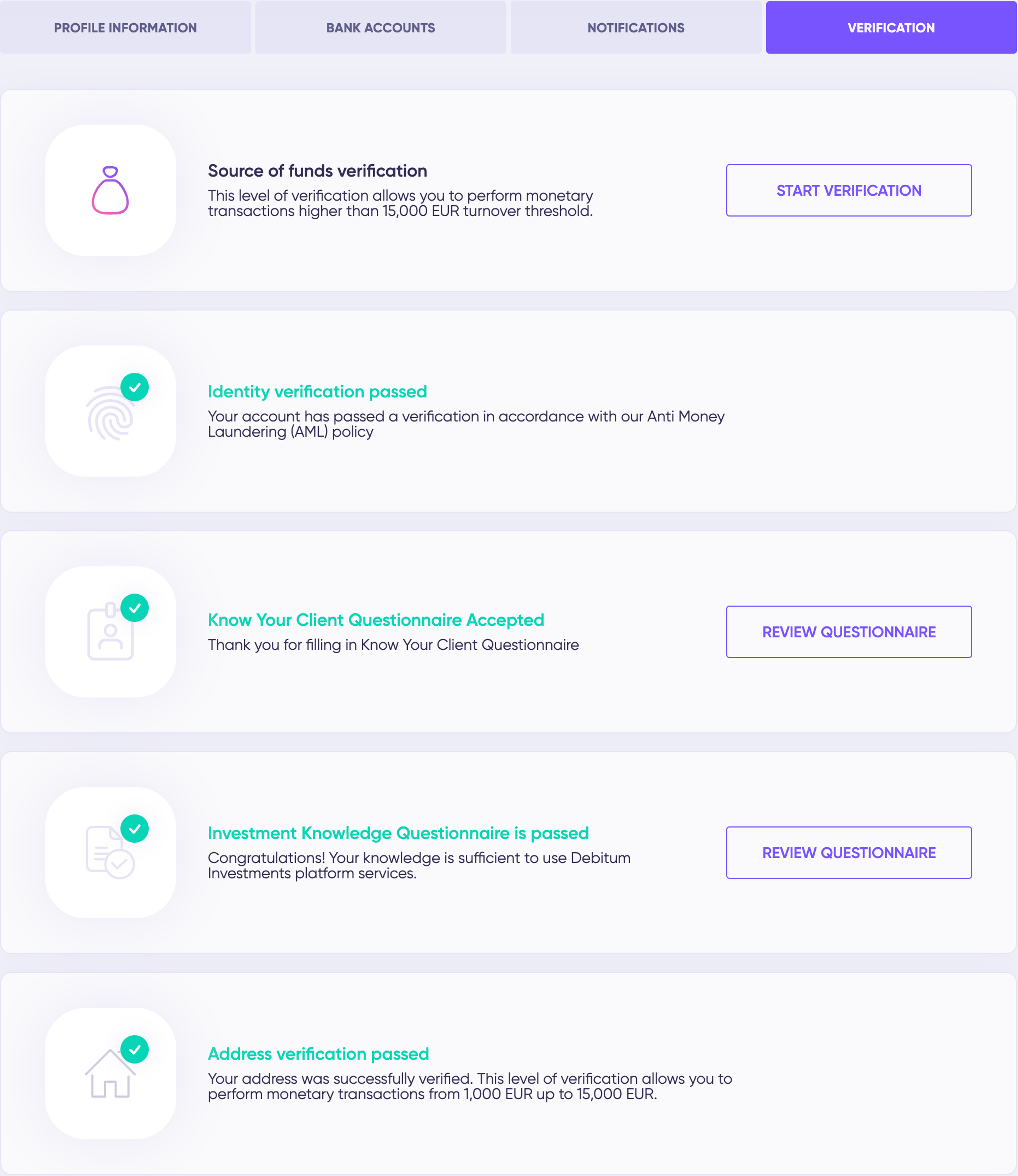 Like the other platforms, it has all the security levels—identity verification and investment knowledge verification are required upon registration, which shows that Debitum cares about the potential client and is focused on safe investments.